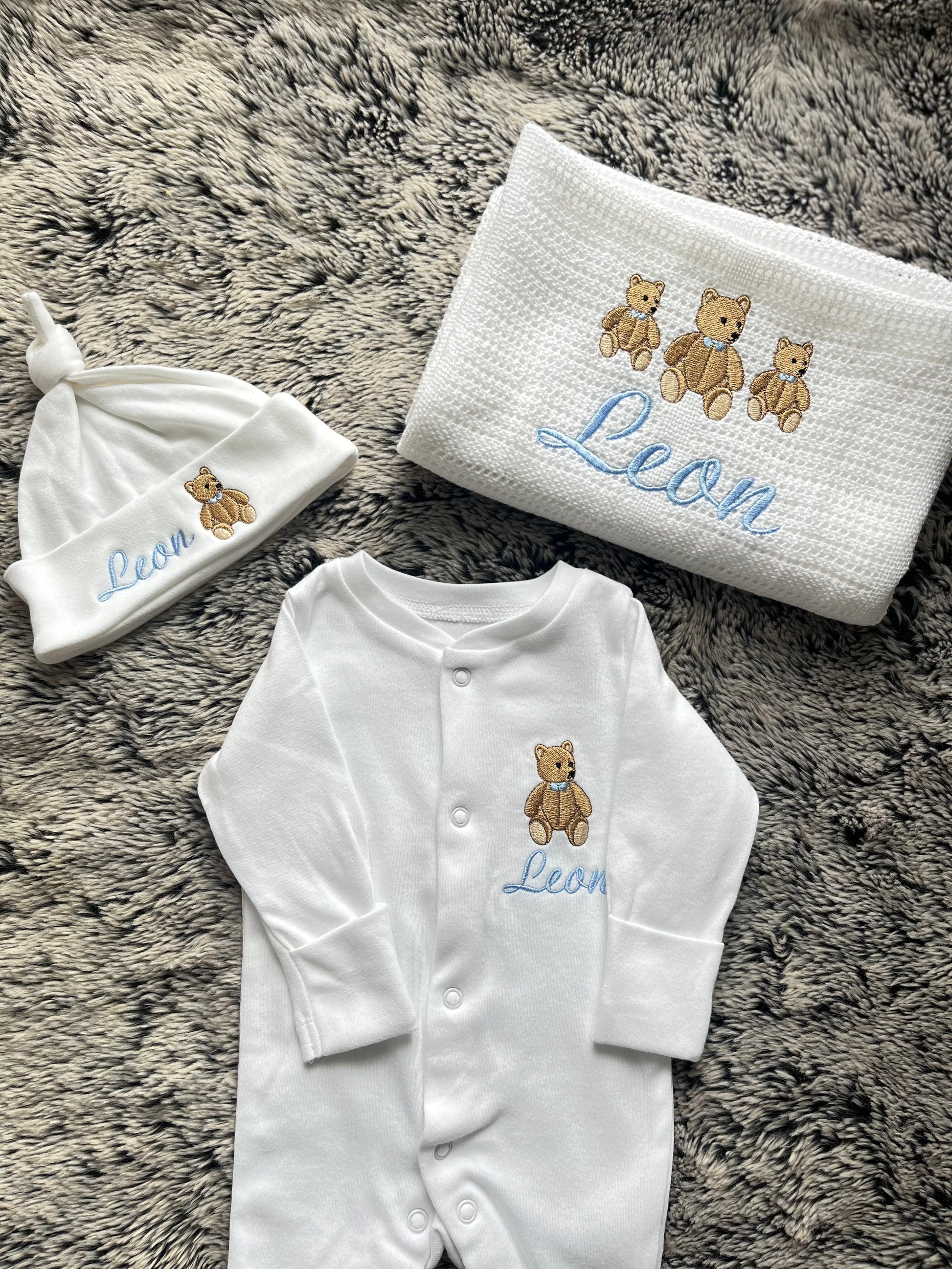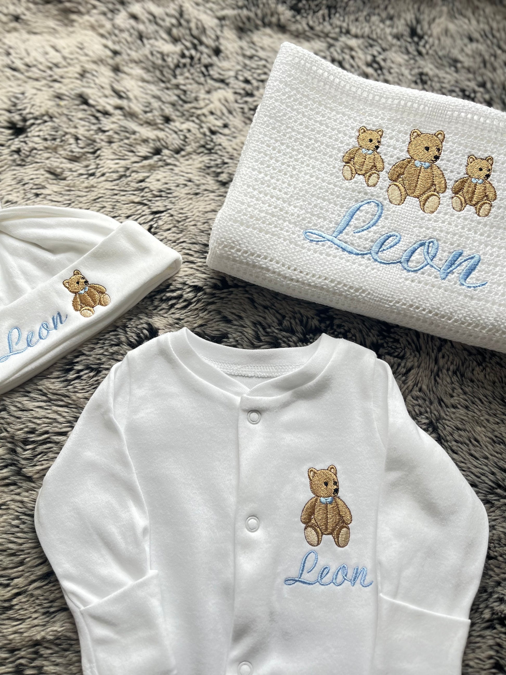 This all-in-one Baby Bear Bundle is the perfect gift for newborns. Featuring a personalised embroidered sleepsuit, hat, and cellular blanket, each item is expertly crafted for ultimate comfort and style.