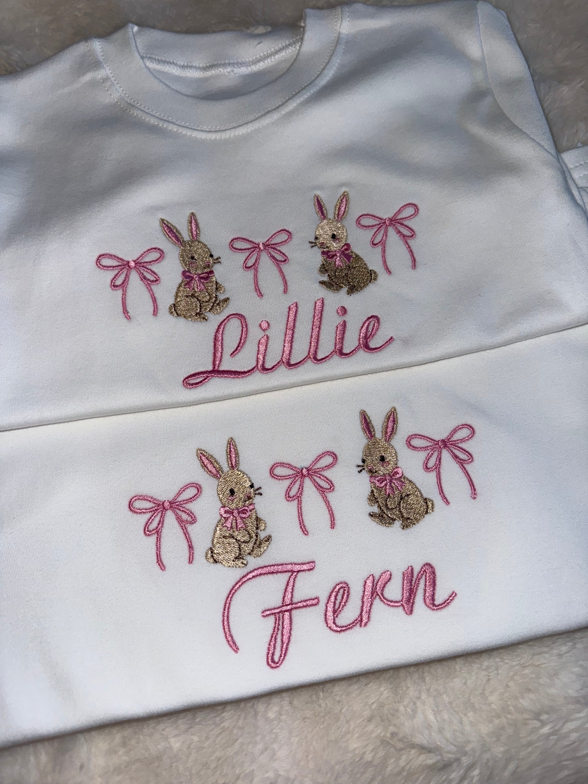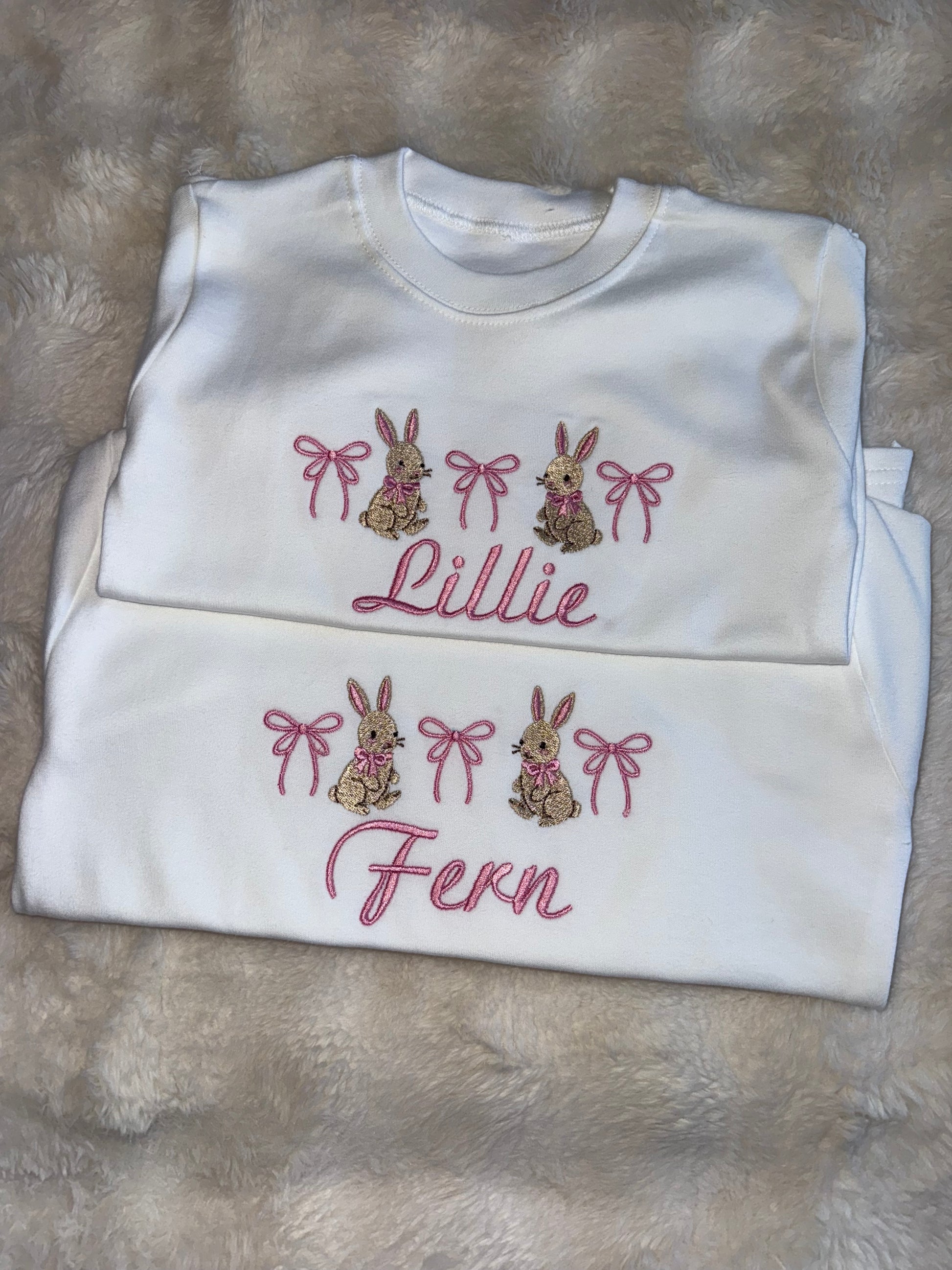 This children's sweatshirt or t-shirt, features an adorable embroidered bunny & bows design with your child’s name, making it the cutest addition to any child's Easter wardrobe.