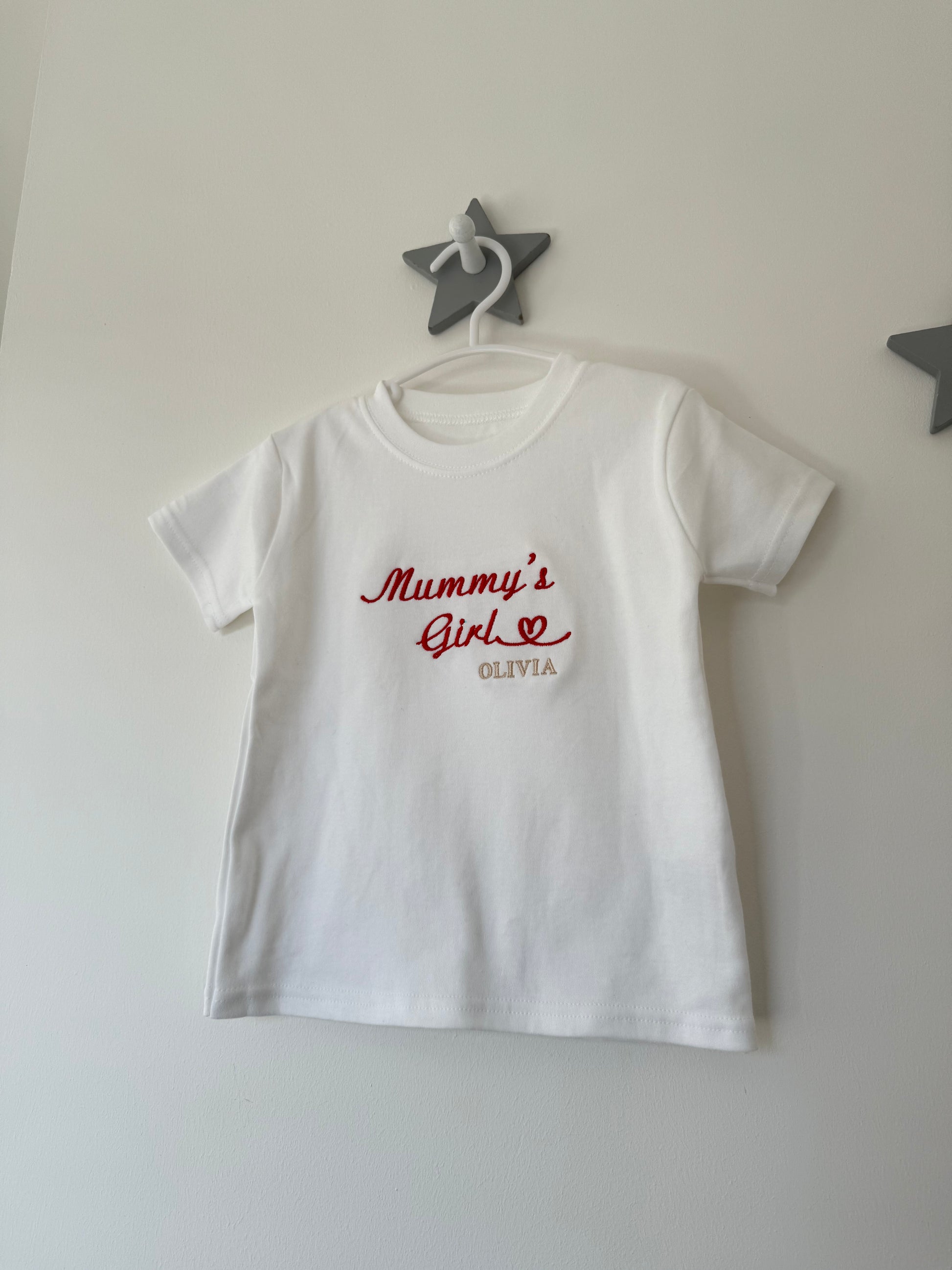 This children's sweatshirt, t-shirt, sleep-suit or long sleeve body suit features an adorable embroidered mummy’s girl design with your child’s name, making it the cutest addition to any child's wardrobe.