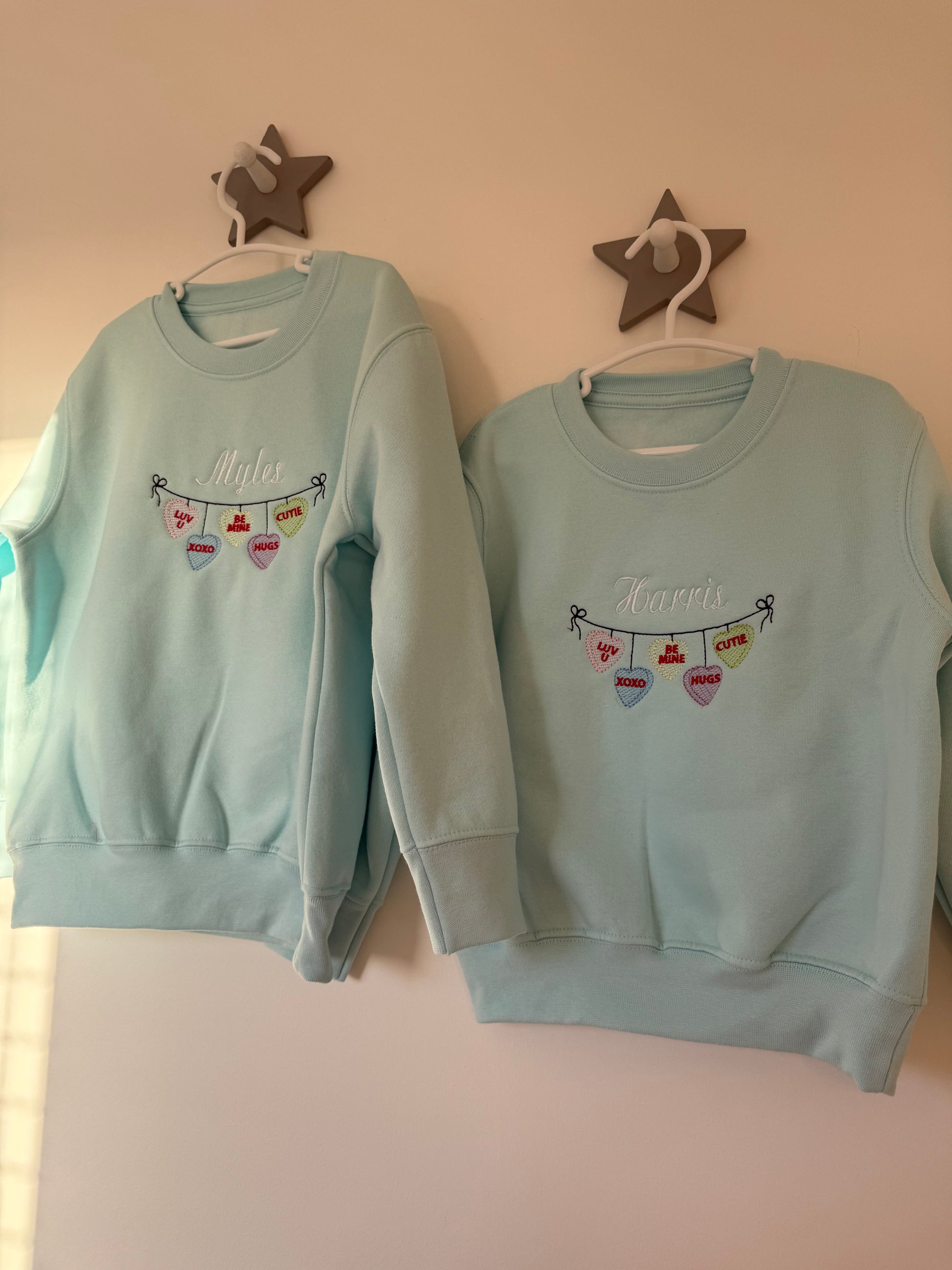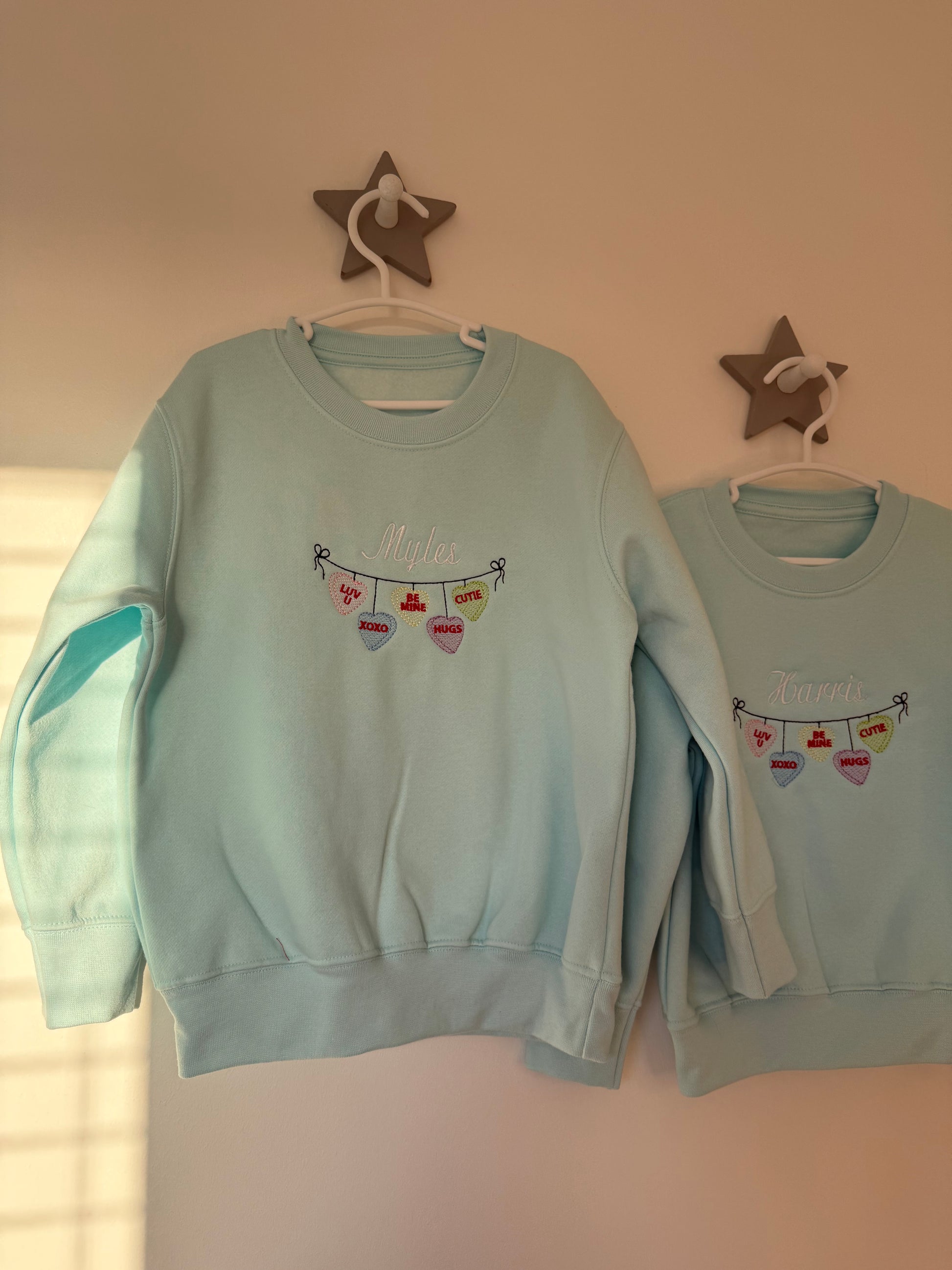 This children's sweatshirt, t-shirt, sleep-suit or long sleeve body suit features an adorable embroidered sweet heart bunting with your child’s name, making it the cutest addition to any child's wardrobe.